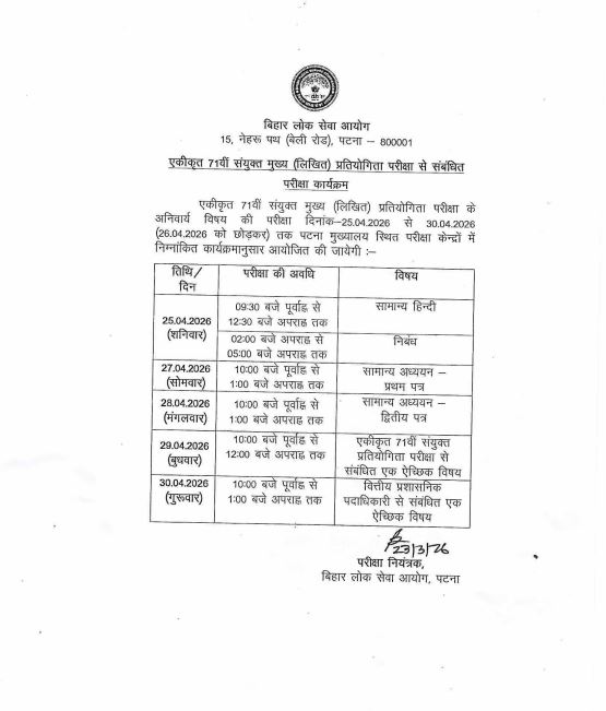 पटना/डेस्क: बिहार मे होने वाले मुख्य परीक्षाओं में से एक BPSC की परीक्षा 25 से 30 अप्रैल तक होगी. ये 71वीं BPSC परीक्षा होने जा रही है. मिली जानकारी के अनुसार इस बार BPSC में 1298 पदों पर भर्ती होगी. जिसे लेकर 25 से 30 अप्रैल तक परीक्षा ली जाएगी.