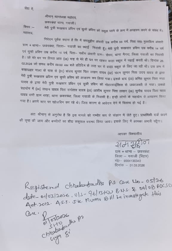 इस मामले में रुखसार परवीन के पिता शमसुद्दीन अंसारी ने छकरबंधा थाना में कांड संख्या 5/26 दर्ज कराते हुए गांव के ही छह लोगों को नामजद आरोपी बनाया है। प्राथमिकी में संजय यादव, चंदन यादव, अमित यादव, लखन यादव, आशीष यादव और सूमिद्र यादव के नाम शामिल हैं। परिजनों का आरोप है कि इन लोगों ने साजिश के तहत दोनों छात्राओं का अपहरण किया है।