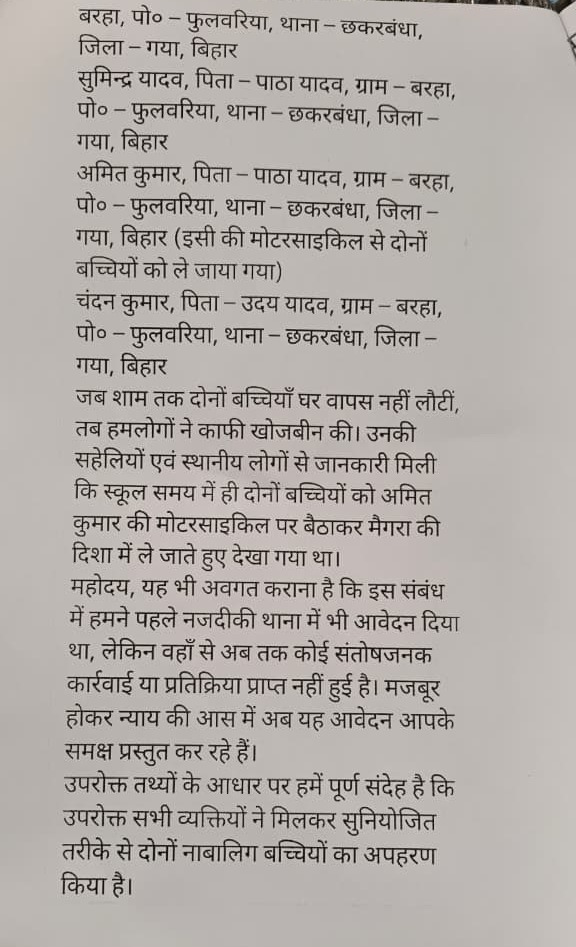 जानकारी के अनुसार, अपहृत छात्राओं की पहचान रुखसार परवीन और सूफी परवीन के रूप में हुई है। दोनों मौसेरी बहनें थीं और रोज की तरह बरहा उच्च माध्यमिक विद्यालय पढ़ने के लिए घर से साथ निकली थीं। लेकिन रास्ते में ही दोनों का अपहरण कर लिया गया। देर तक घर नहीं लौटने पर परिजनों ने खोजबीन शुरू की, लेकिन कोई पता नहीं चल सका।